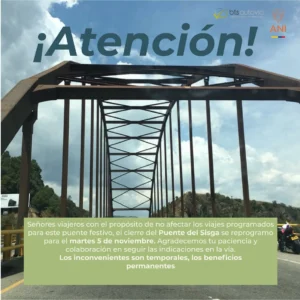 «Señores viajeros con el propósito de no afectar los viajes programados para este puente festivo, el cierre parcial del Puente del Sisga se reprogramo para el martes 5 de noviembre», informó Francisco Gnecco, Gerente de la Concesión BTS, que además aseguró que durante el cierre parcial del Puente Sisga se garantizará la circulación.