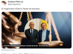 “El magistrado Alberto Yepes se expresa”, dijo el presidente Petro en su cuenta en X, luego de compartir un documento que fue titulado como “La Corte Suprema no está por encima de la ley”, en el portal Unicornio.co.